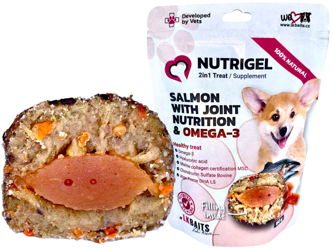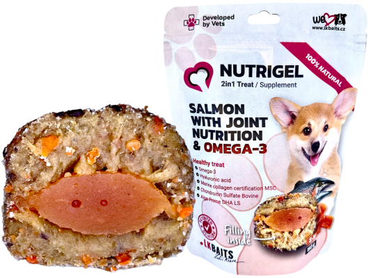 LK Baits Pet NUTRIGEL TASTY DOG – Losos s kloubní výživou a OMEGA-3 Zdravé mlsání s kloubní výživou a probiotiky.Objevte chytrý pamlsek 3v1 NUTRIGEL , který nejen báječně chutná, ale navíc podporuje zdravý pohyb, výživu a normální funkci organismu.O produktu Pamlsek 3v1 NUTRIGEL obsahuje výběrové maso z lososa s přídavkem lososového oleje a čistého omega 3 oleje z řas Algae .Tento unikátní pamlsek je obohacen o kloubní výživu Nutrigel Marine Collagen.Nabízíme produkt, který se může pozitivně podílet na zdraví vašeho psa a zároveň je skvělou odměnou. Celý popis