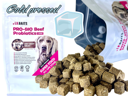 LK BAITS pet PRO-BIO – Hovězí granule lisované za studena s probiotikyNaše super prémiové krmivo PRO-BIO je komplexní nutričně vyvážená potrava, kterou váš pes potřebuje pro zdravý a vitální život.Za studena lisované krmivo LK Baits PRO BIO pomáhá udržovat psy všech věkových kategorií (All Life Stages) ve výborné kondici a celkové životní pohodě.Šetrná technologie výrobyPoužíváme moderní italskou výrobní linku s technologií COLD PRESSED, kde dochází ke stlačení ingrediencí bez ztráty kvality.Teplota při výrobě nepřesáhne 38 °C. Celý popis